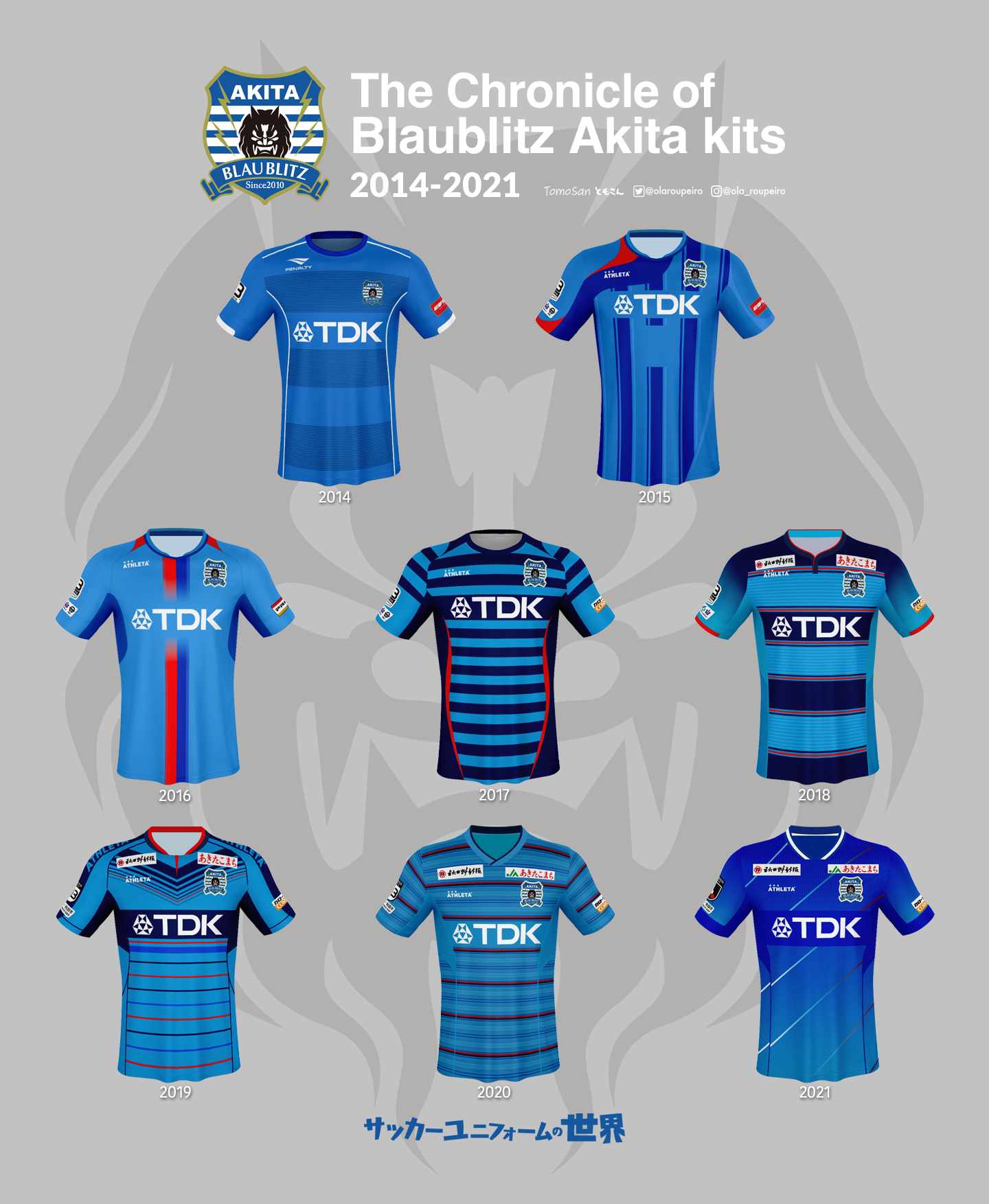 ともさん Tomosan サッカーユニフォームの世界 ブラウブリッツ秋田のjリーグ歴代ユニフォームをみてみよう クラブ名の ブラウブリッツ Blaublitz はドイツ語で 青い稲妻 の意味 エンブレムのなまはげがかっこいい あなたの思い出の